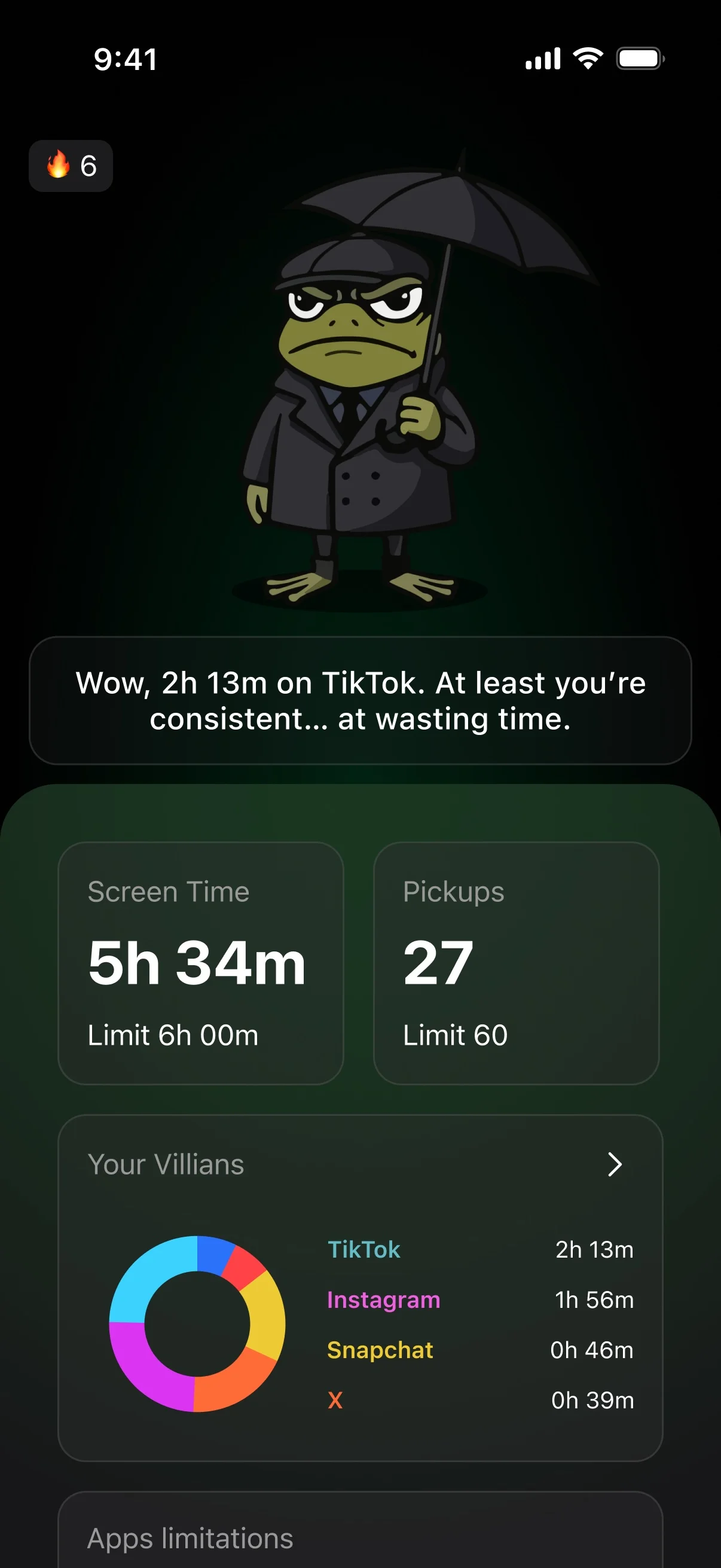 Frogged tracks every "just five minutes" every pointless scroll, and every time you "just check" something — then roasts you until you finally get your life back.